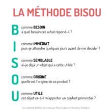 La méthode BISOU est un moyen mnémotechnique qui te permet de te poser 5 questions essentielles avant de prendre une décision d’achat. Elle a été popularisée par Marie Duboin Lefèvre et Herveline Verdeken, autrices de livres comme J’arrête de surconsommer ou L’abus de consommation responsable rend heureux !.