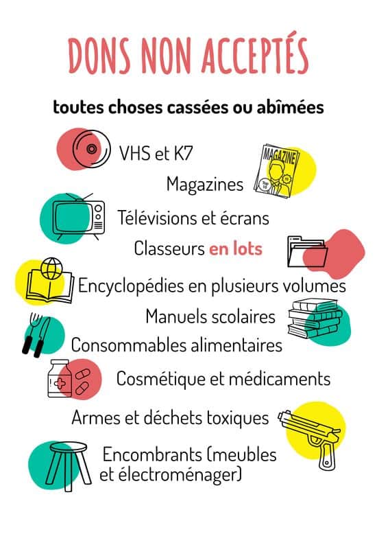 Nous ne prenons pas également les télévisions et écrans, les VHS et K7, magazines, encyclopédies en plusieurs volumes, manuels scolaires et classeurs en lots.